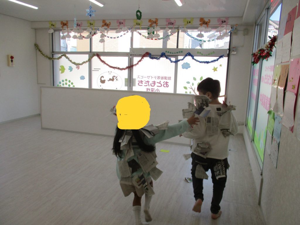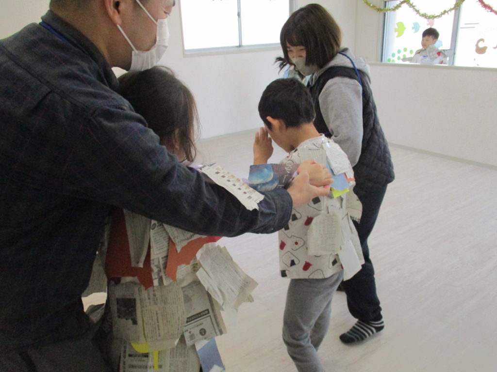 裂いた新聞紙を服に貼り付け、取って取られて誰が一番立派なミノを持つことができるか❤️🔥