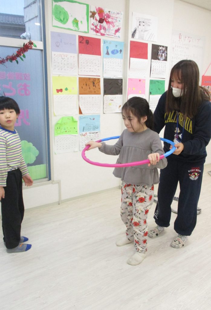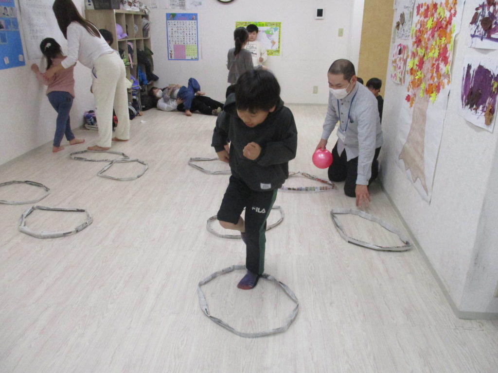 片足立ちで輪っかを続けて飛んでいきます。