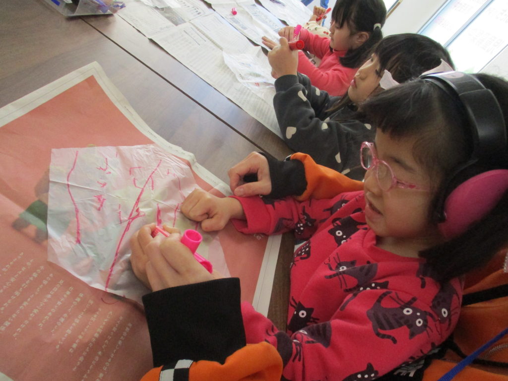 自分で選んだ色のテープを貼ったり、自由に絵や文字を描いていきます。