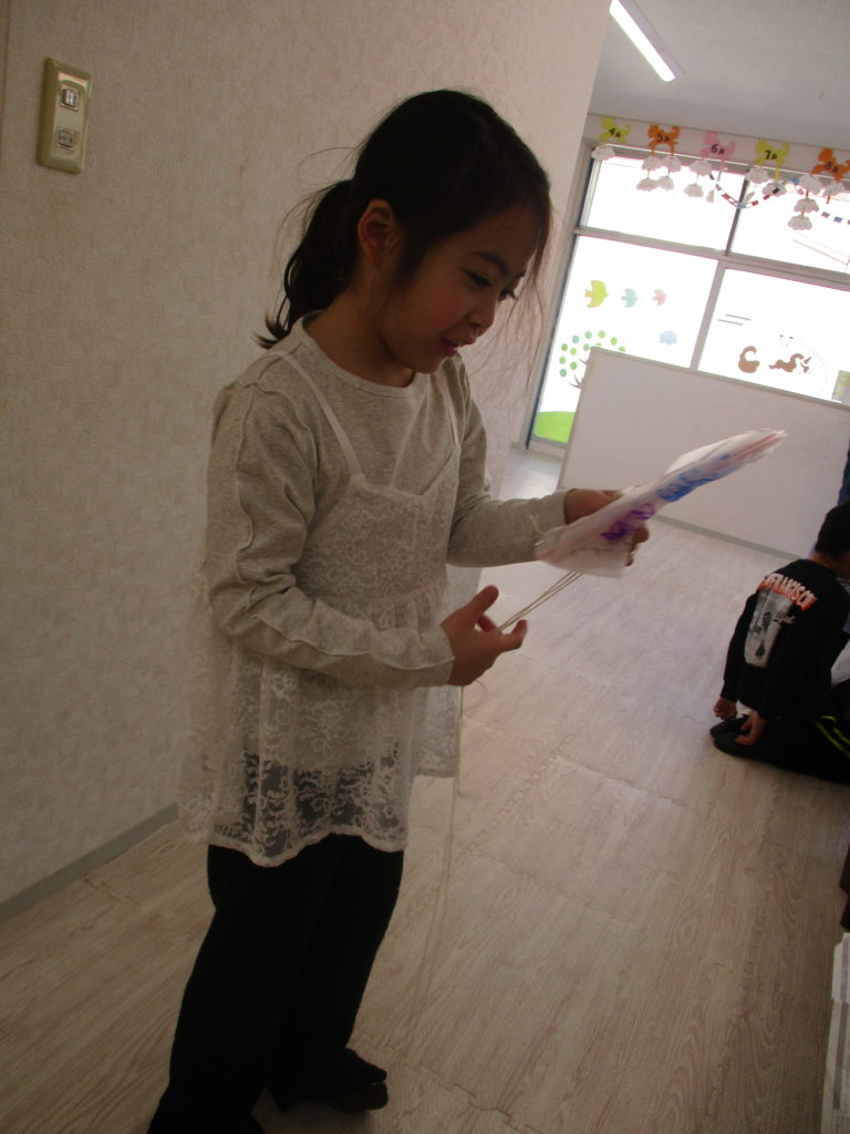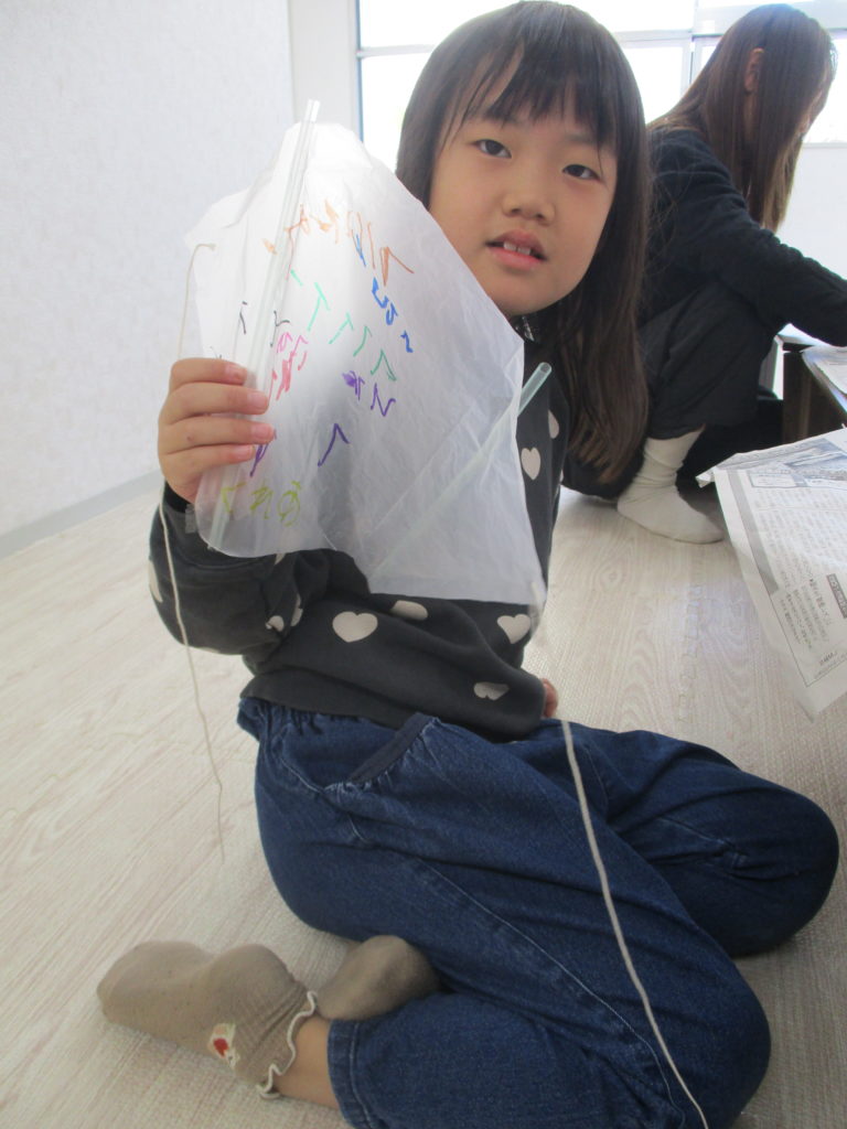 ビニールに自由に絵を描き、ストローの骨組みと糸を付けて凧を作ります。