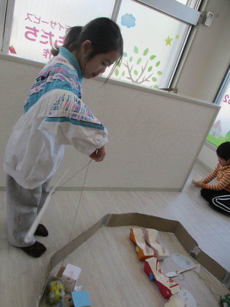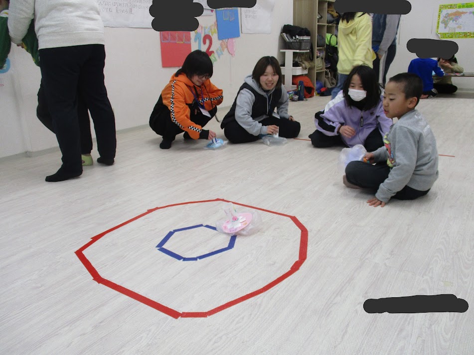 完成した子から順にカーリングの的、目掛けてすぃーっと投げて遊びました!