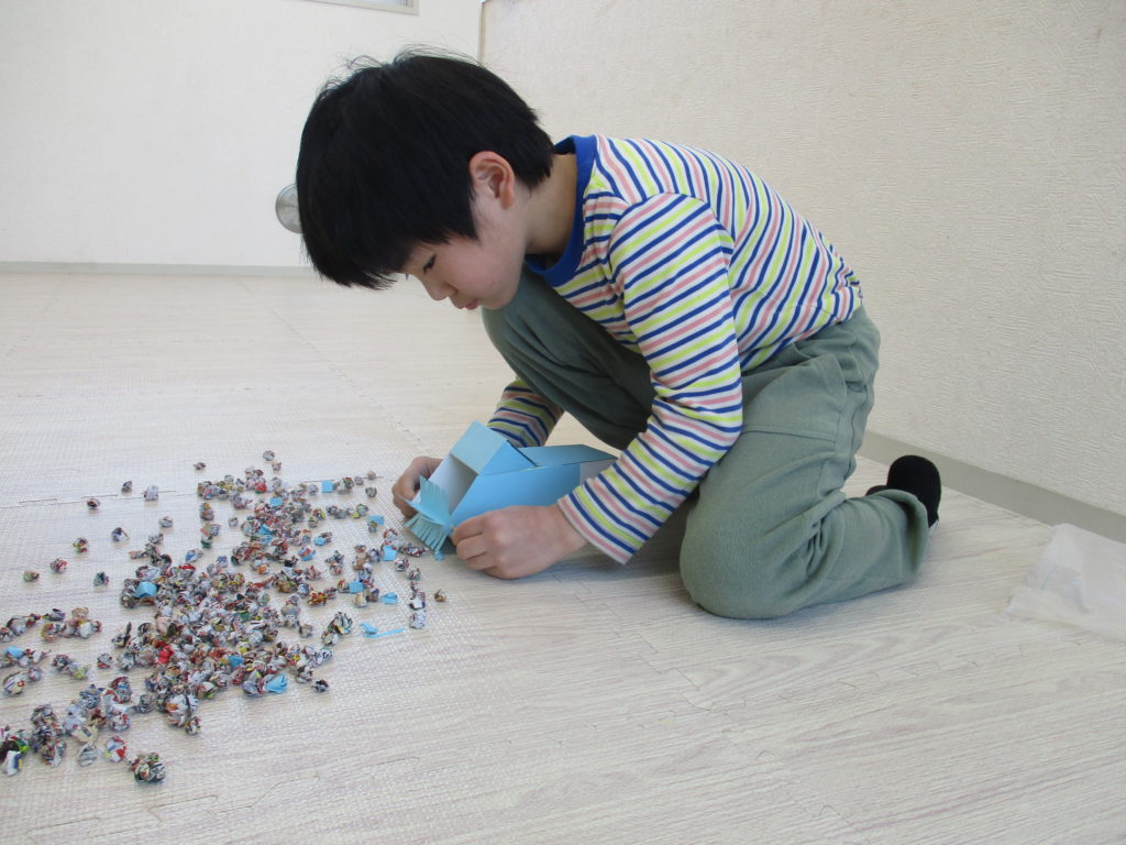 新聞紙を細かくしたものをゴミに見立てて